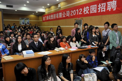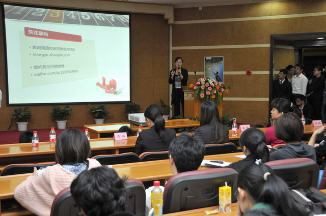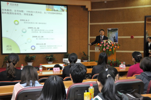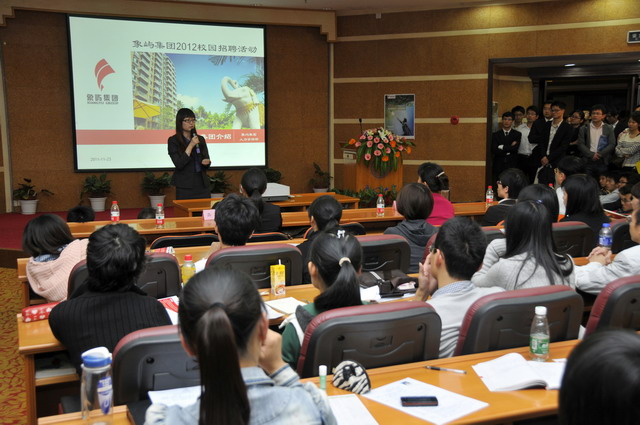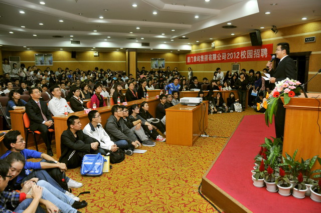 2012年象嶼集團全國校園招聘首場宣講會于11月23日晚在廈門大學(xué)拉開帷幕。集團人力資源總監(jiān)林志勇、象嶼股份人力資源部經(jīng)理林焱為同學(xué)們進行了精彩的宣講并回答了同學(xué)們現(xiàn)場的提問,鼓勵廈大的優(yōu)秀學(xué)子們加入到象嶼的大家庭。據(jù)悉,此次宣講會吸引了近500位應(yīng)屆生參加,場面火爆,提問環(huán)節(jié)積極踴躍,會后現(xiàn)場收到簡歷近500 份。