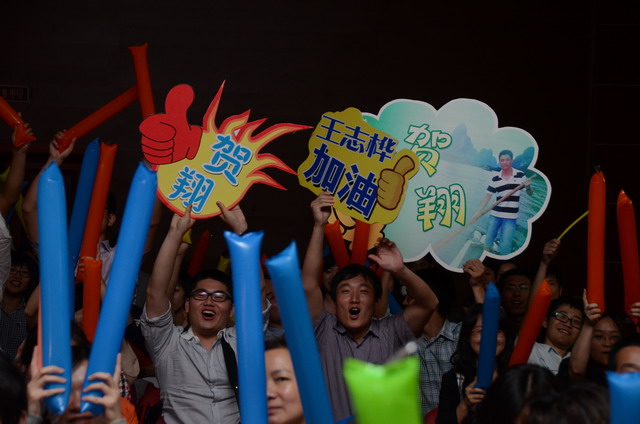 在激揚(yáng)的歌曲聯(lián)唱《五月的花?!分?,歌唱比賽正式開始。16名選手按組別輪流登場,現(xiàn)場精彩萬分。歌聲或激蕩高昂,或宛轉(zhuǎn)悠揚(yáng),或徐徐如風(fēng),或渾厚有力;表現(xiàn)力或動(dòng)感十足,或動(dòng)靜相宜,或幽靜宜人;曲風(fēng)各異,或熱辣奔放,或溫暖抒情,或自然歡快,或懷舊悠揚(yáng)。啦啦隊(duì)陣容也不容小覷,加油牌、口哨、熒光棒一應(yīng)俱全,或歌唱伊始吶喊助威,或伴隨著歌聲興奮地?fù)]舞著手臂,更有甚者激動(dòng)地走到臺上為選手喝彩,臺上臺下照相印襯、融為一體。期間,軍企拉歌、擊鼓傳花等活動(dòng)環(huán)節(jié)也將比賽推向一個(gè)又一個(gè)高潮。