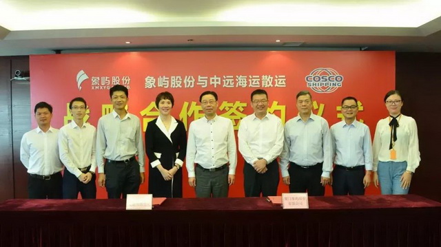 8月3日,廈門象嶼股份有限公司與中遠(yuǎn)海運(yùn)散貨運(yùn)輸有限公司舉行戰(zhàn)略合作協(xié)議簽署儀式。象嶼股份黨委書記、總經(jīng)理鄧啟東、中遠(yuǎn)海運(yùn)散運(yùn)黨委副書記、總經(jīng)理?xiàng)钪緢?jiān)分別代表雙方公司在戰(zhàn)略合作協(xié)議上簽字,象嶼股份副總經(jīng)理、象嶼速傳總經(jīng)理肖靜勤、中遠(yuǎn)海運(yùn)散運(yùn)營(yíng)銷中心總監(jiān)謝光盛等領(lǐng)導(dǎo)出席了簽約儀式。