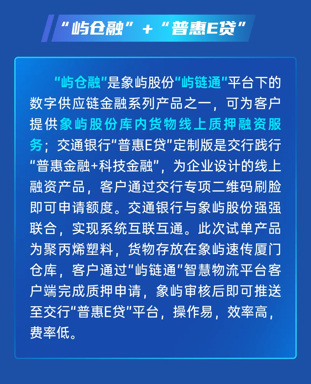 象嶼“嶼倉融”助力交行“普惠E貸”數(shù)字倉單質(zhì)押融資業(yè)務(wù)成功落地!